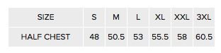 | Half Chest (cm) | 51 | 53.5 | 56 | 58.5 | 61 | 63.5 |